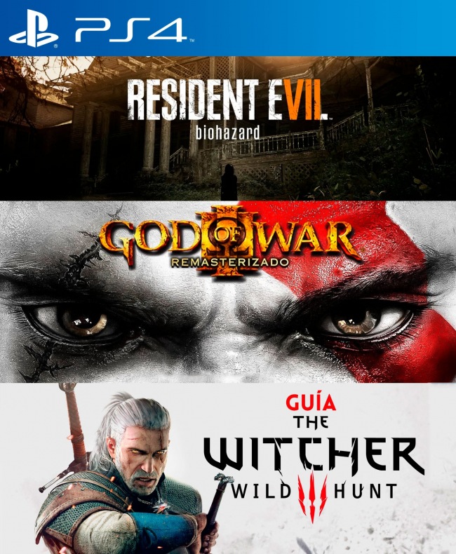 El pack incluye: - ARESIDENT EVIL 7 BIOHAZARD PS4 - GOD OF WAR III REMASTERED PS4 - The Witcher 3 Wild Hunt PS4 Pesos de los juegos : 89 GB Requerido en consola : 100 GB Instalación : 1 consola